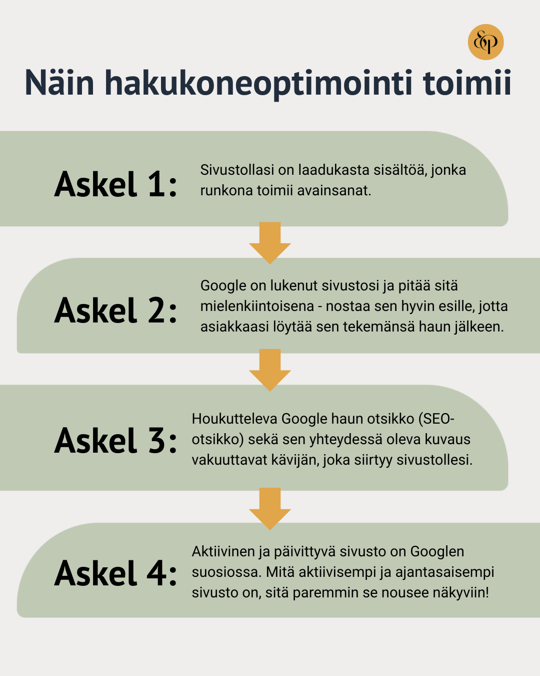 Hakukoneoptimoinnin (eli SEO:n) tavoitteena on parantaa verkkosivustosi näkyvyyttä Googlessa ja muissa hakukoneissa. Kun asiakas etsii tietoa, palvelua tai tuotetta, hakukone pyrkii tarjoamaan hänelle mahdollisimman osuvia ja luotettavia sivustoja. Jos sivustosi ei näy hakutuloksissa, se jää helposti kilpailijoiden varjoon – vaikka sinulla olisi kuinka hyvä tuote tai palvelu.